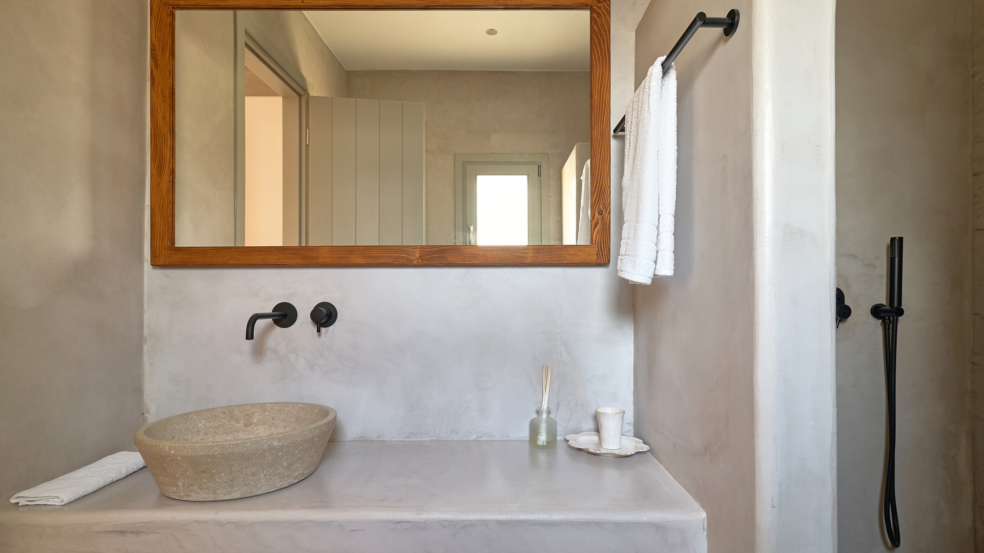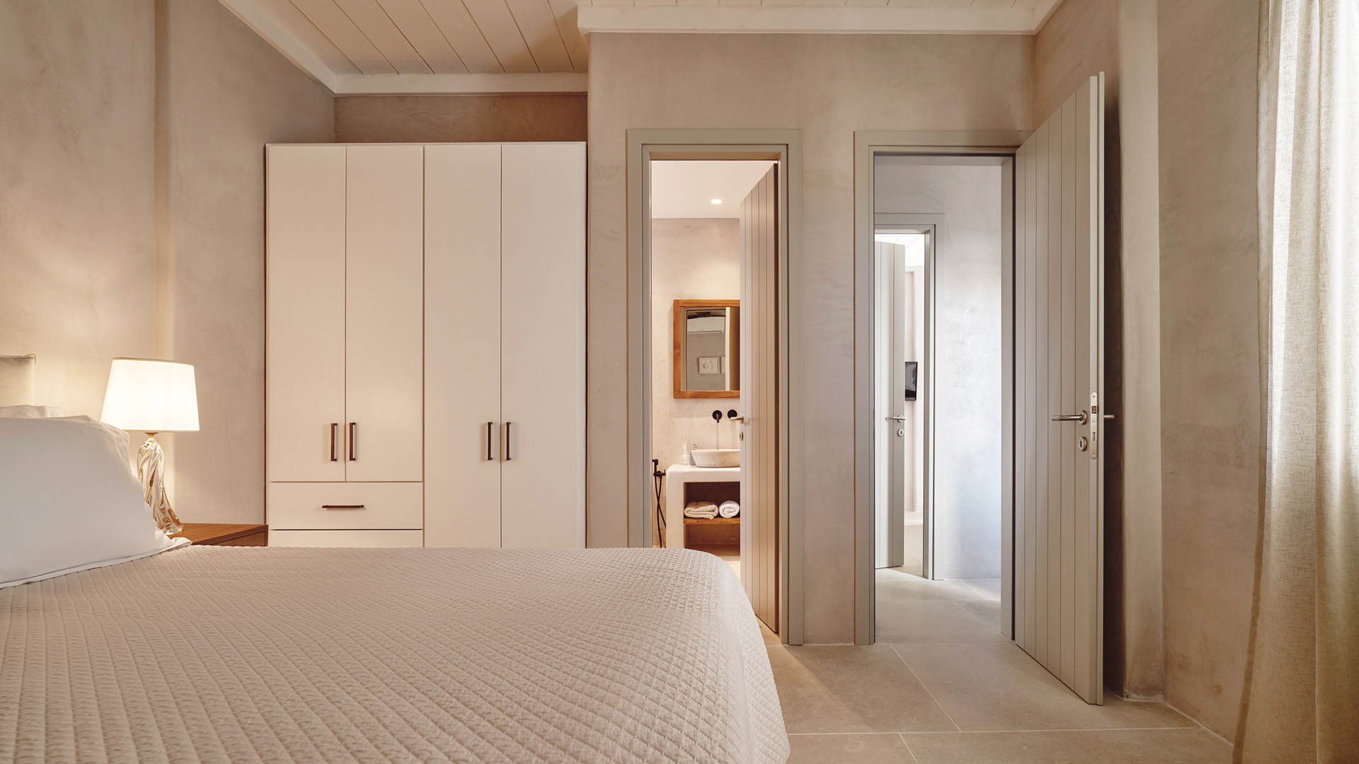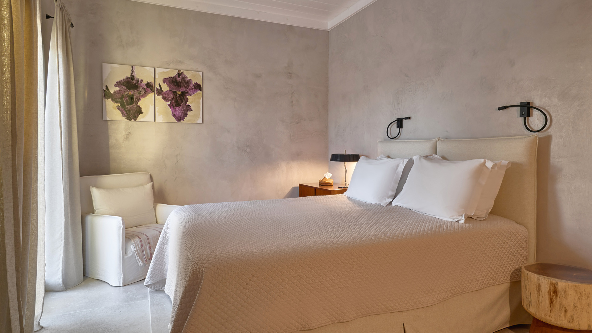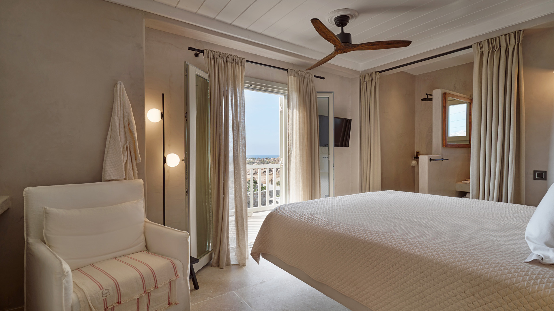 Inside Junonia, the same refined aesthetic continues, with well-appointed common areas that exude a warm and welcoming atmosphere despite the contemporary design and abundance of modern amenities. The bedrooms are evenly distributed across the two levels of the house, with a fifth independent room available for those seeking extra privacy. All rooms maintain the same high-quality standards, while those on the upper floor enjoy lovely sea views from their private balconies.