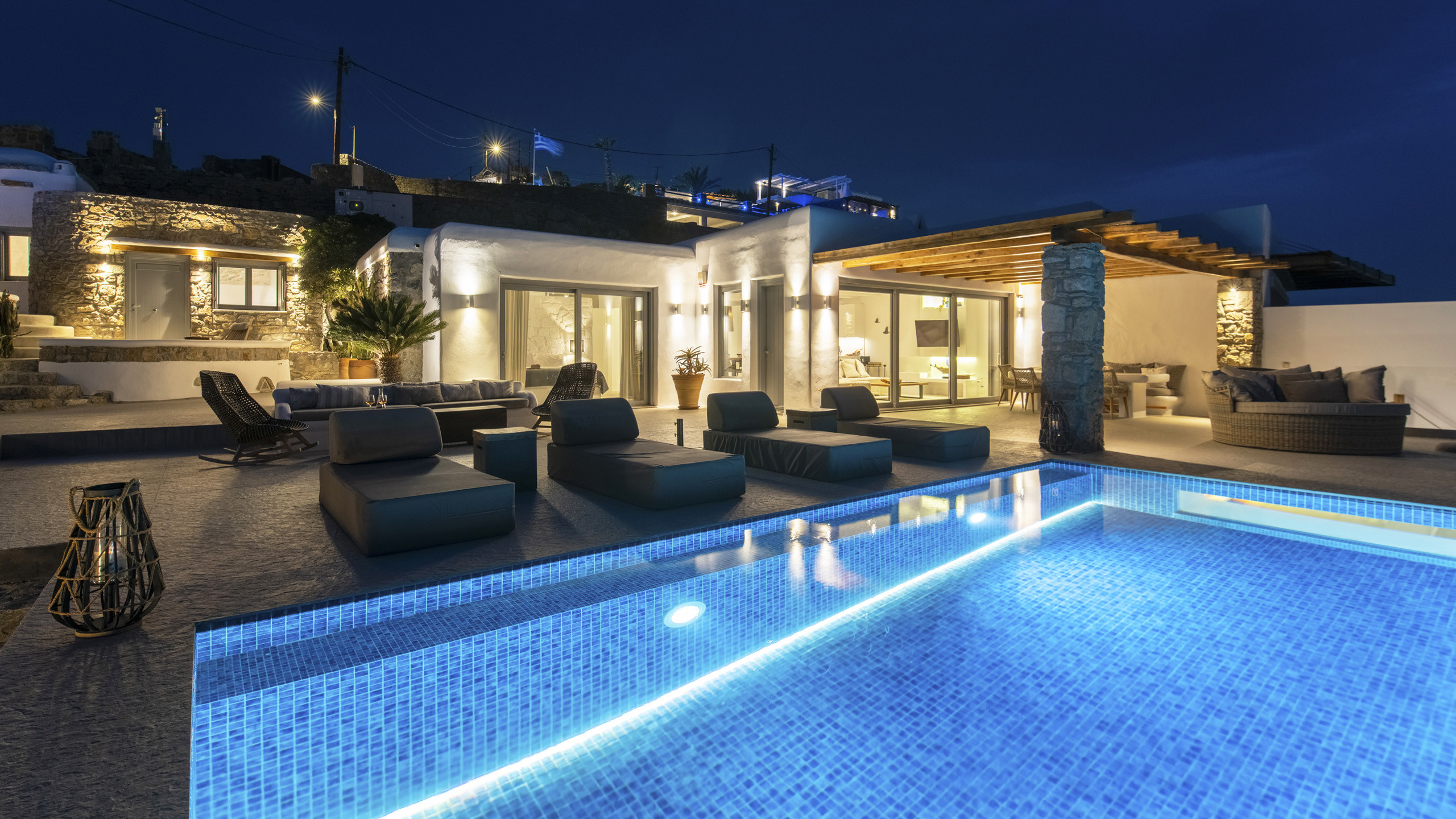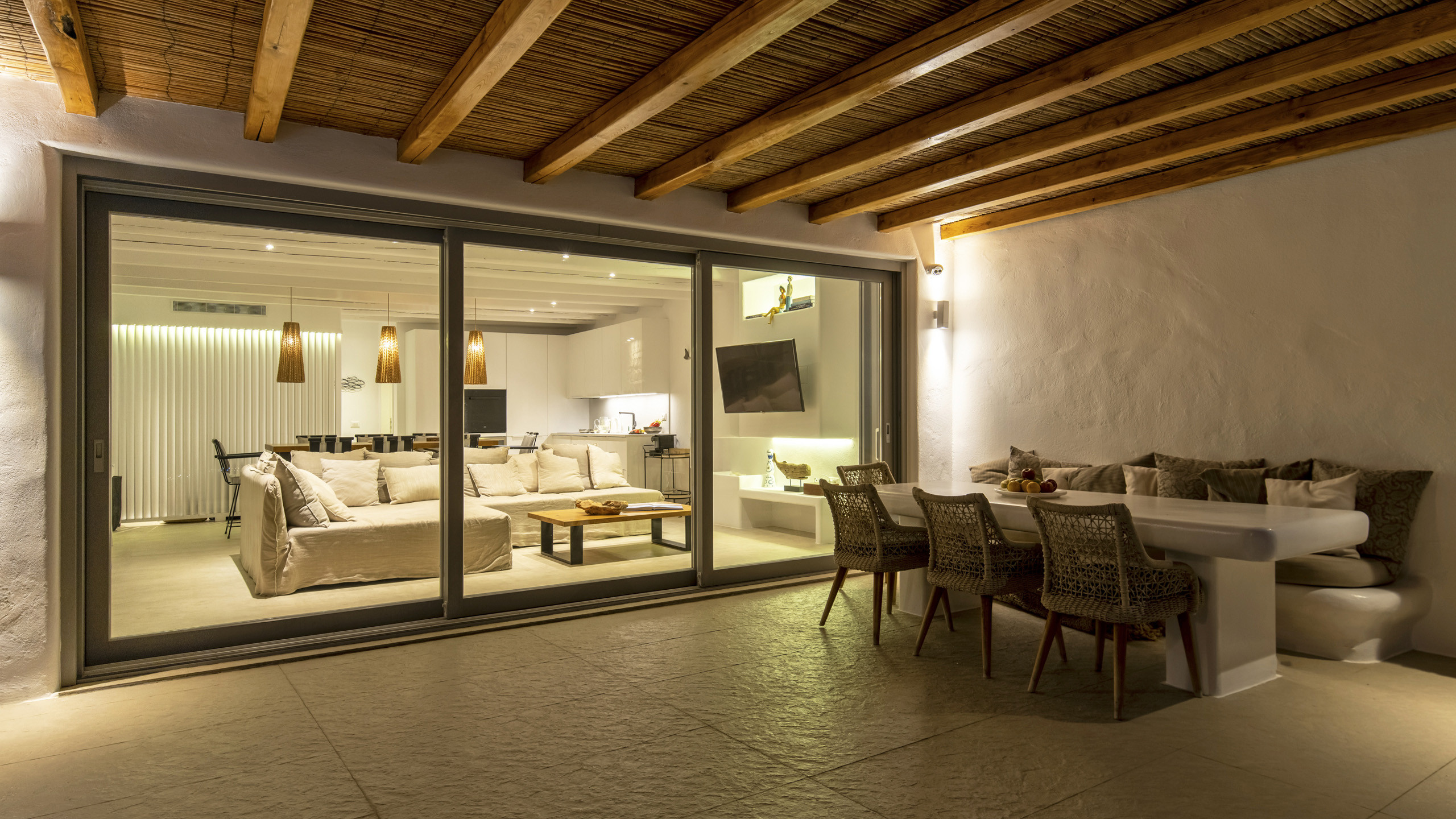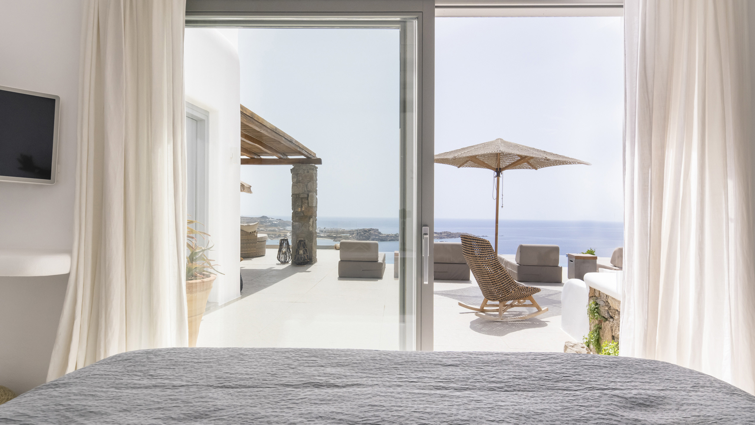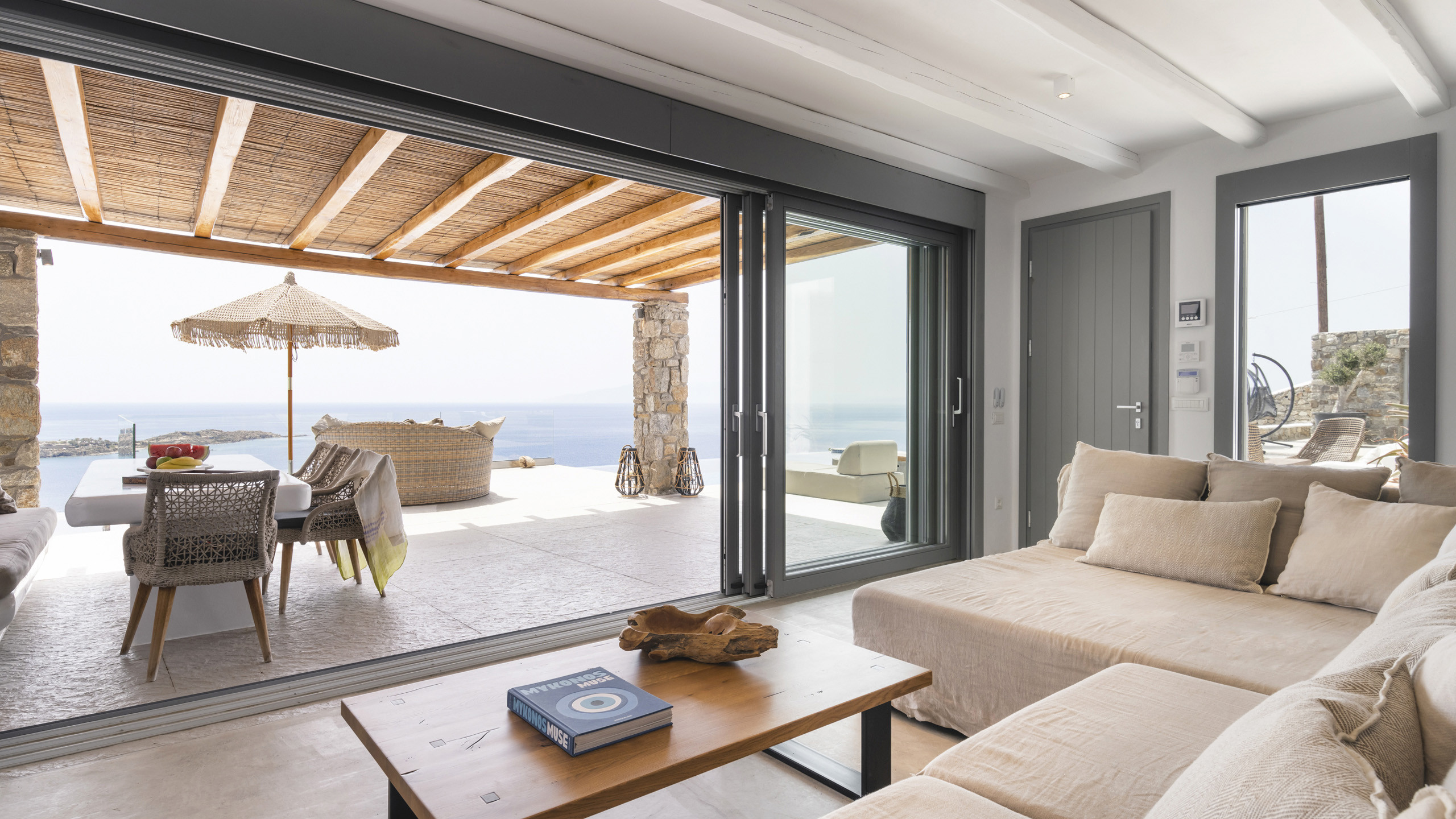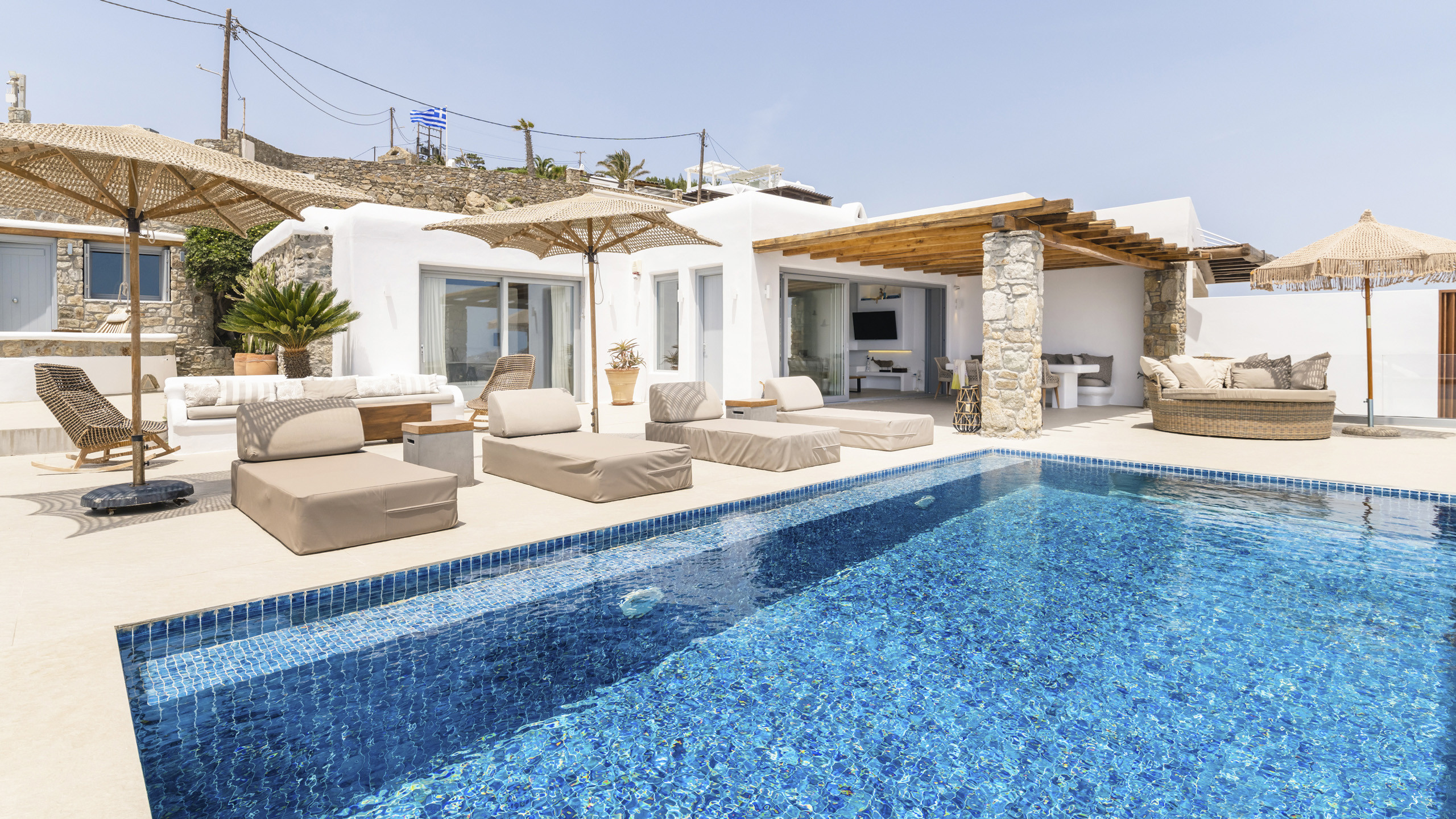 Internally, Aegean Dawn features a fresh and contemporary style that perfectly follows the typical trend and style of Mykonian private residences. The common spaces and bedrooms are all comfortable and equipped with the latest technological amenities, also directly connected to the outdoors for the guests' maximum independence.