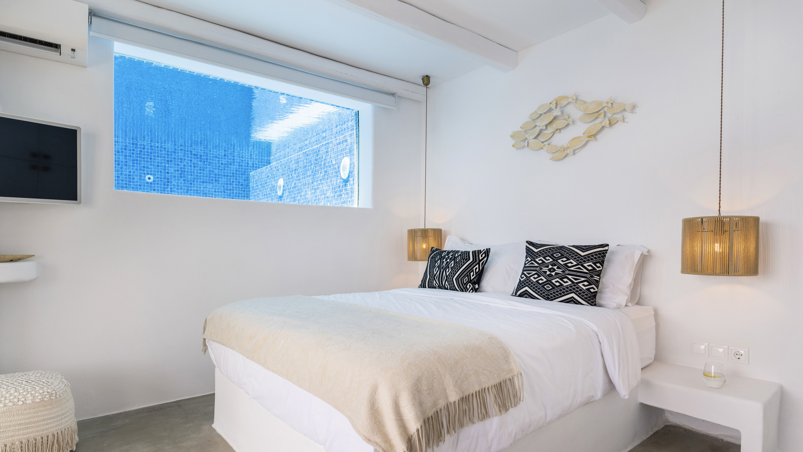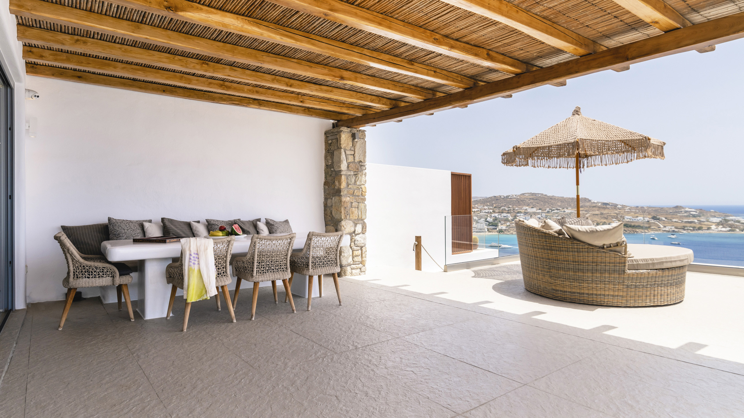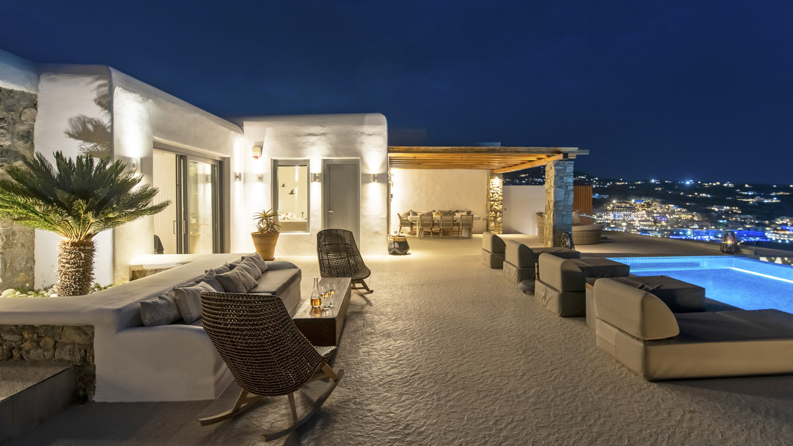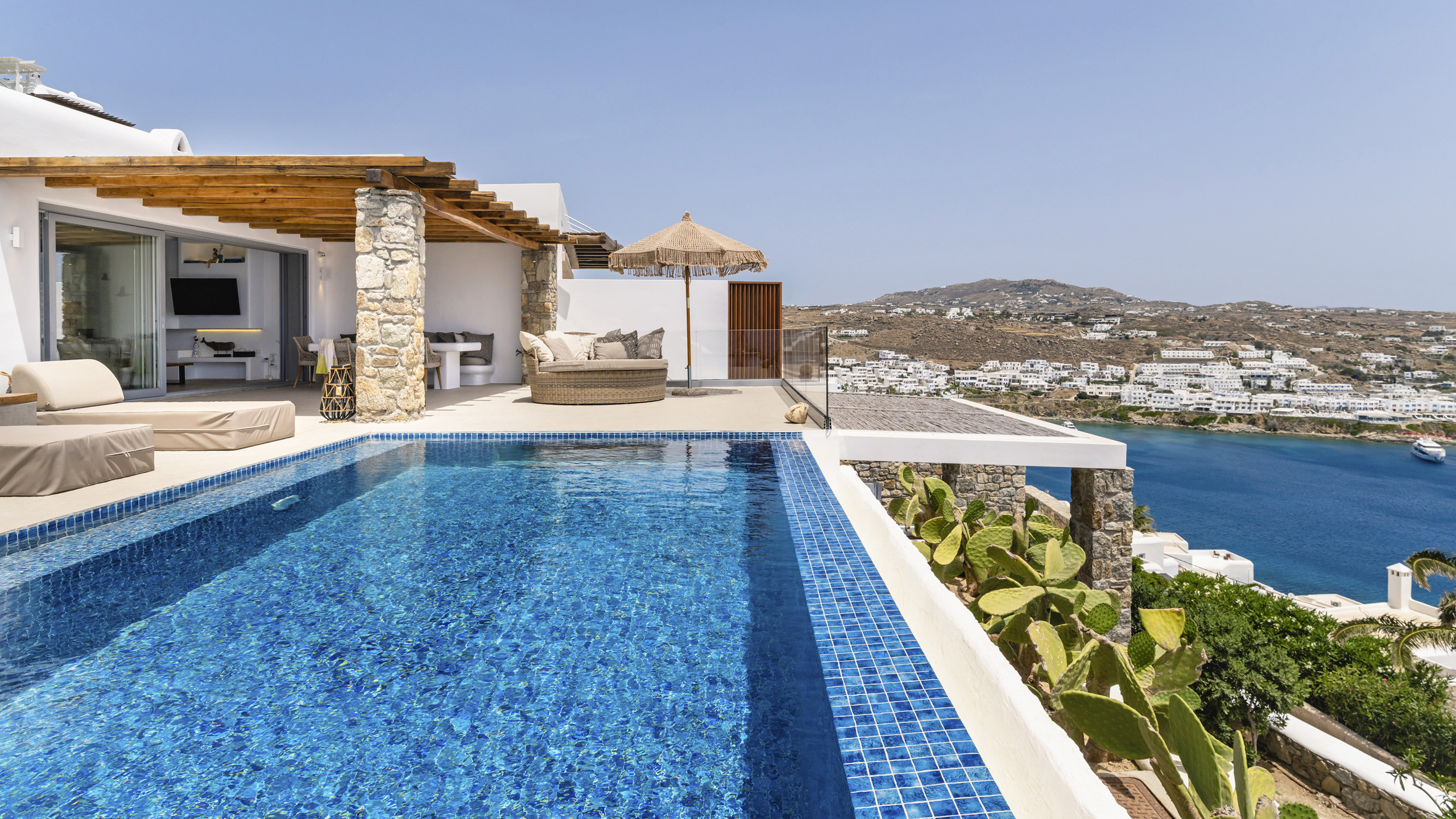 Internally, Aegean Dawn features a fresh and contemporary style that perfectly follows the typical trend and style of Mykonian private residences. The common spaces and bedrooms are all comfortable and equipped with the latest technological amenities, also directly connected to the outdoors for the guests' maximum independence.