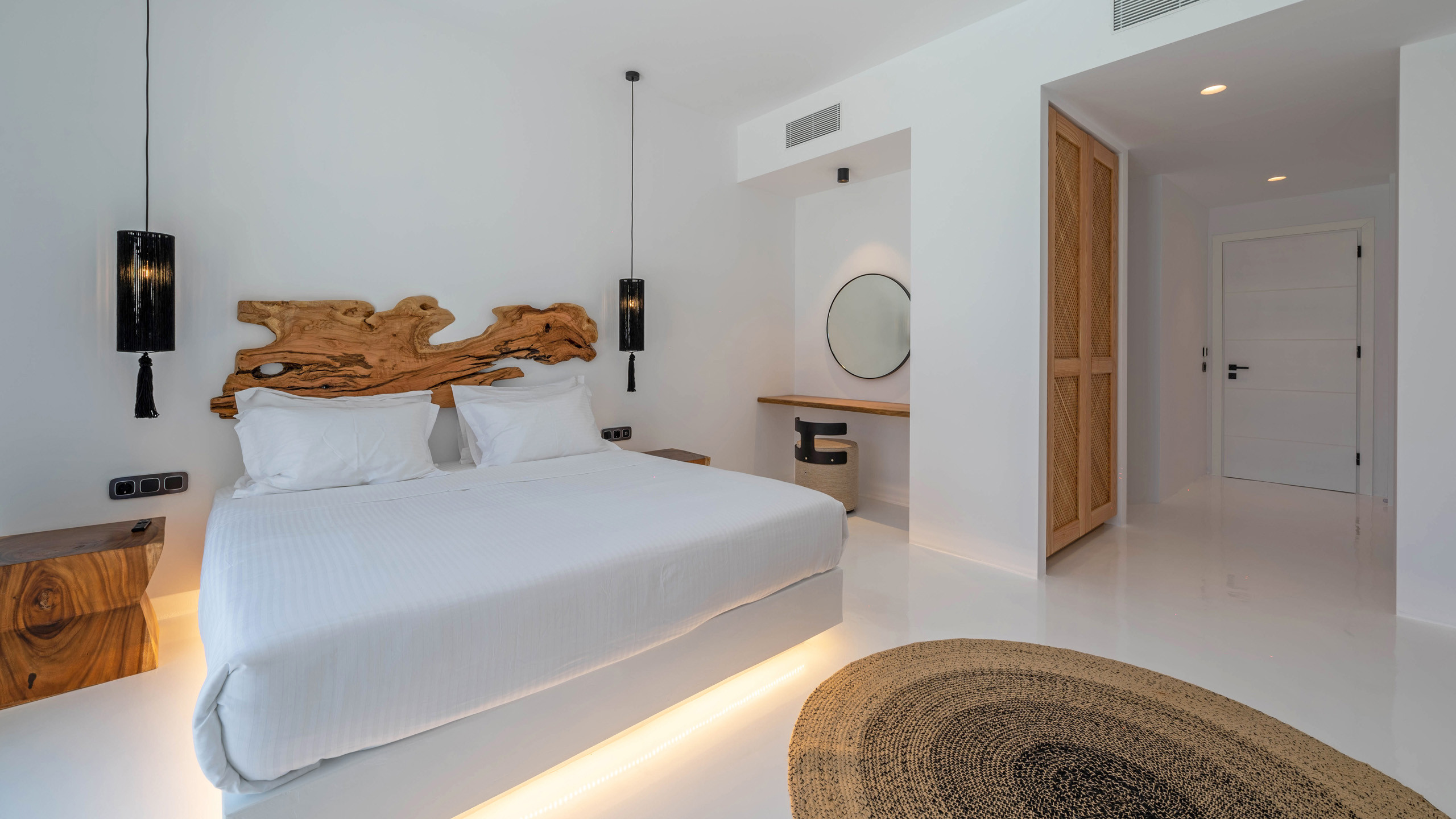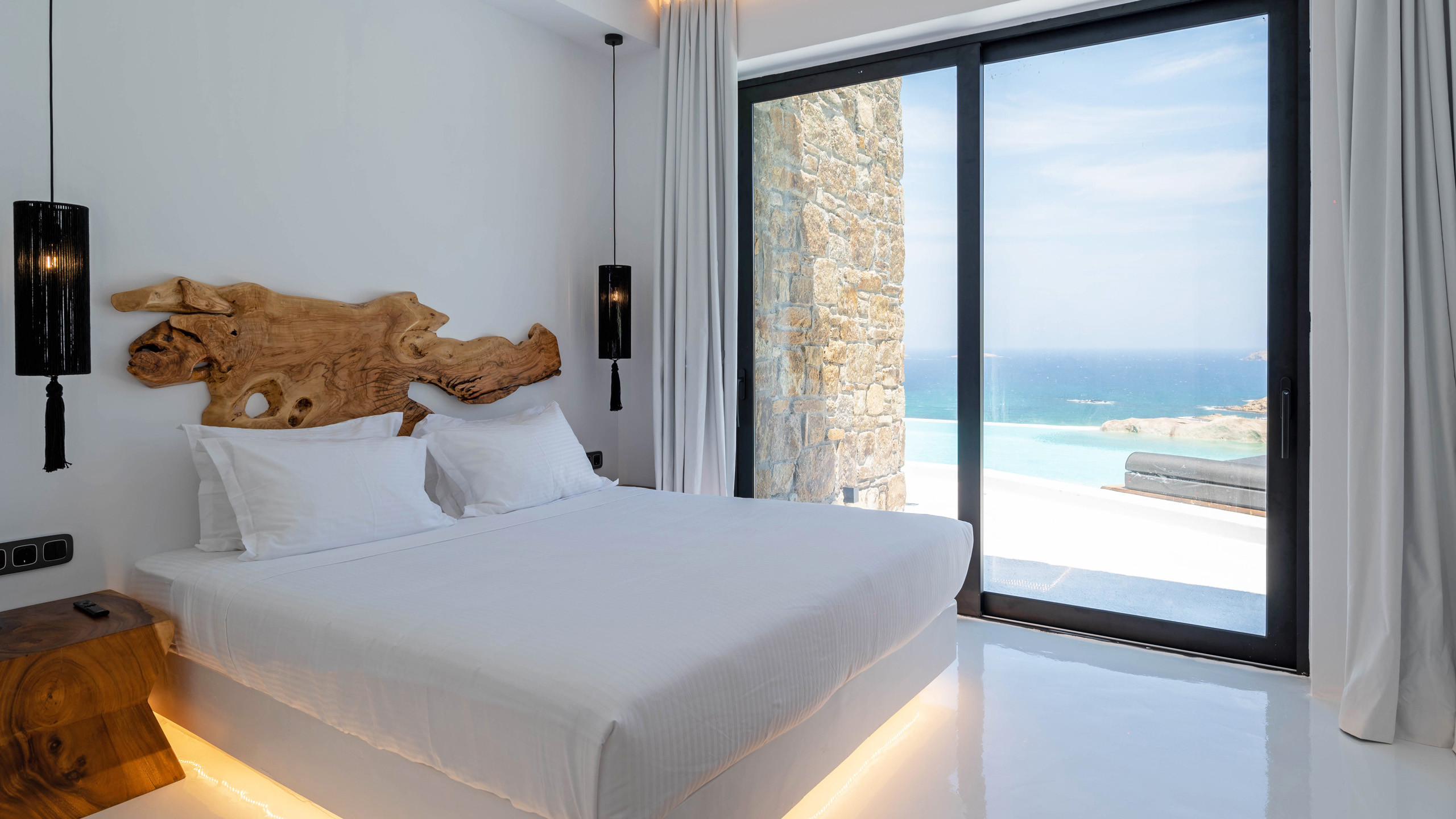 Inside, the property is characterized by contemporary and minimalist furnishings, with the distinctive feature of many pieces being their black color. The bedrooms are all quite similar, simple and comfortable, opening onto the main terrace with a sea view.