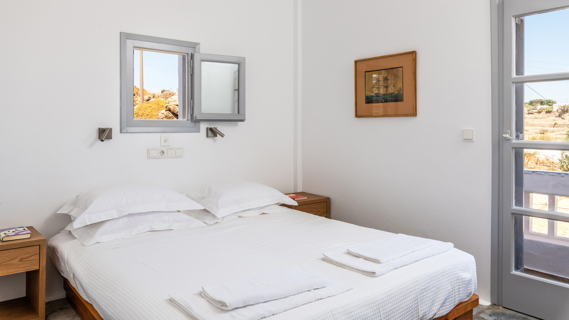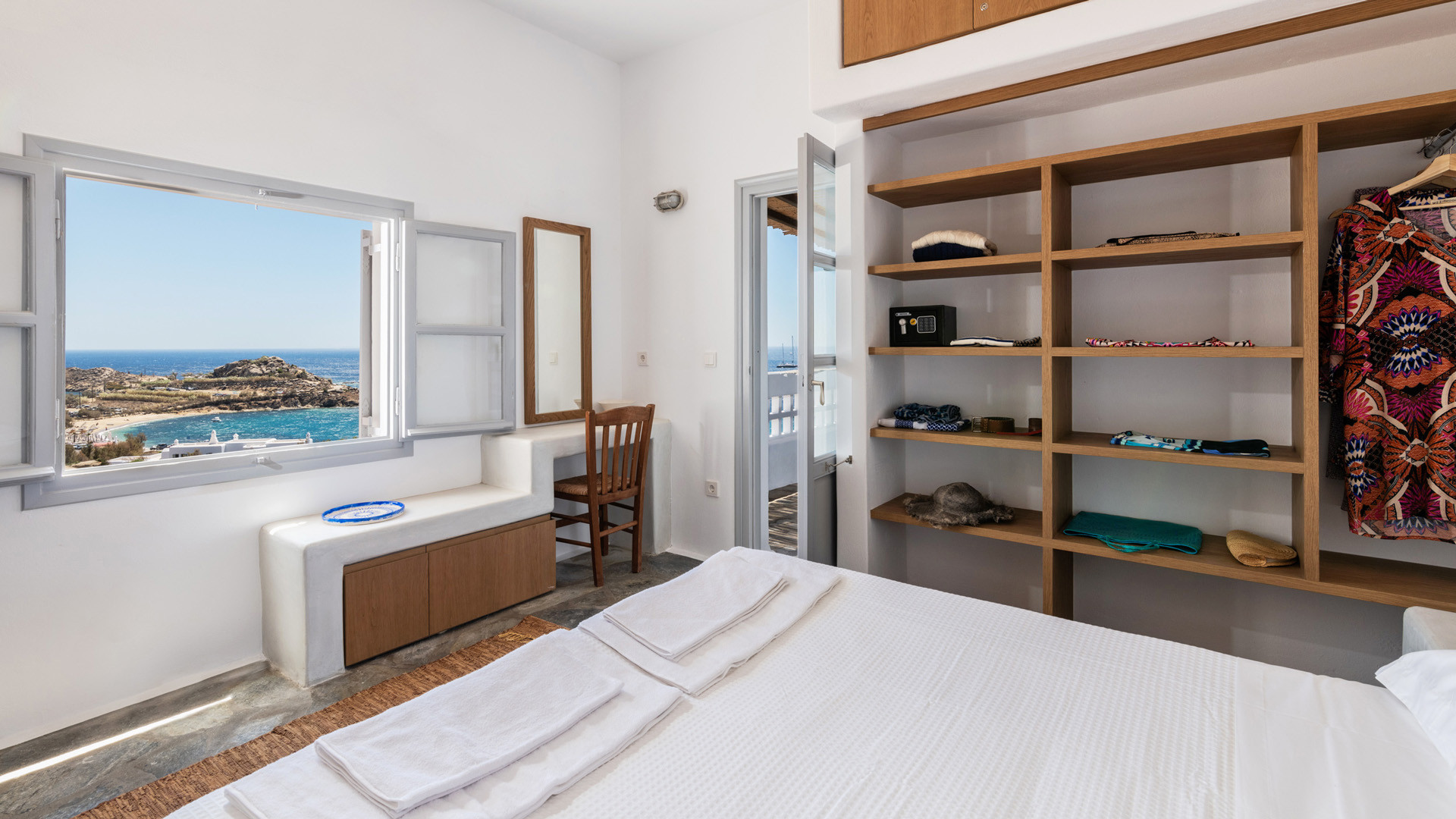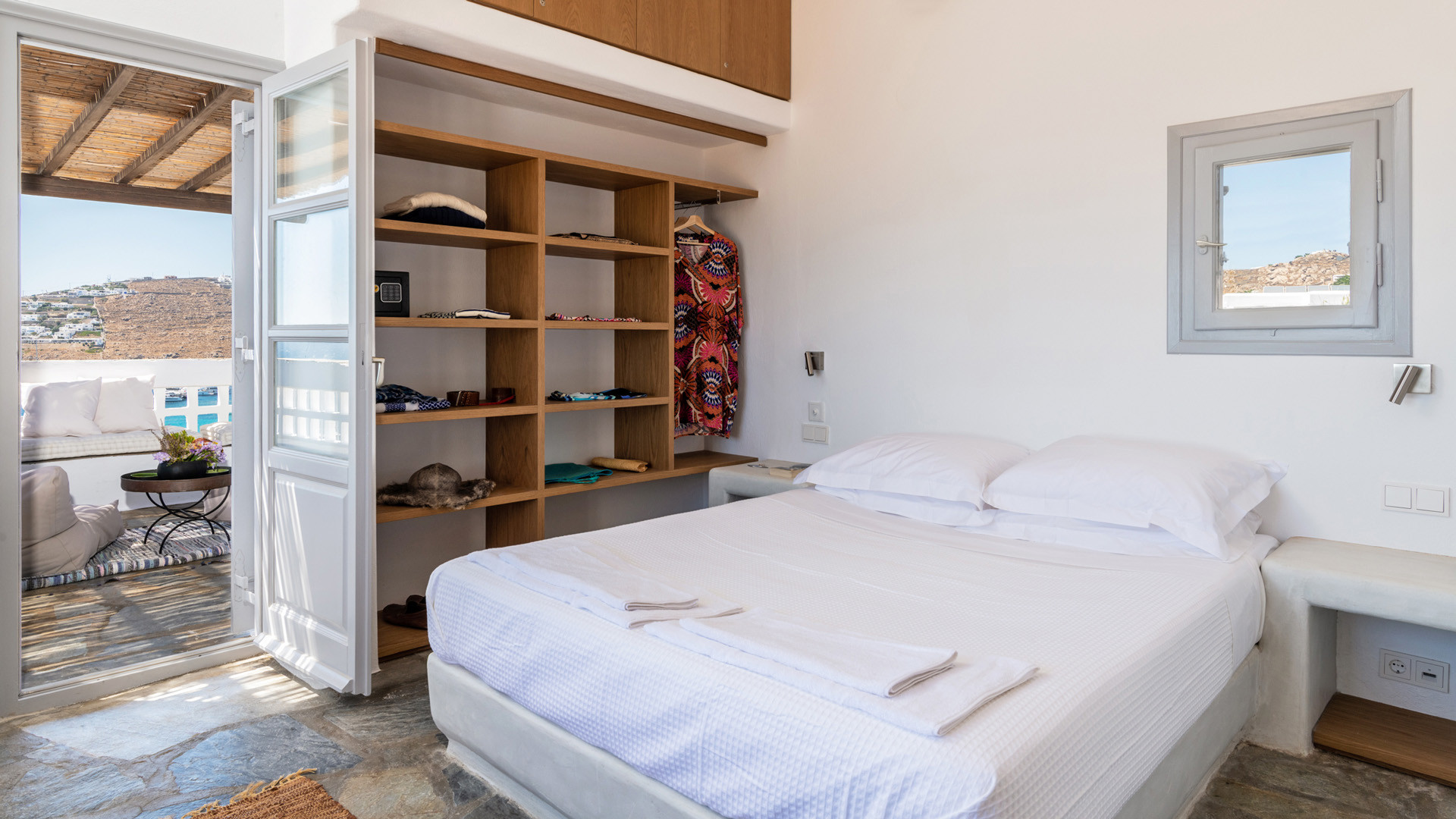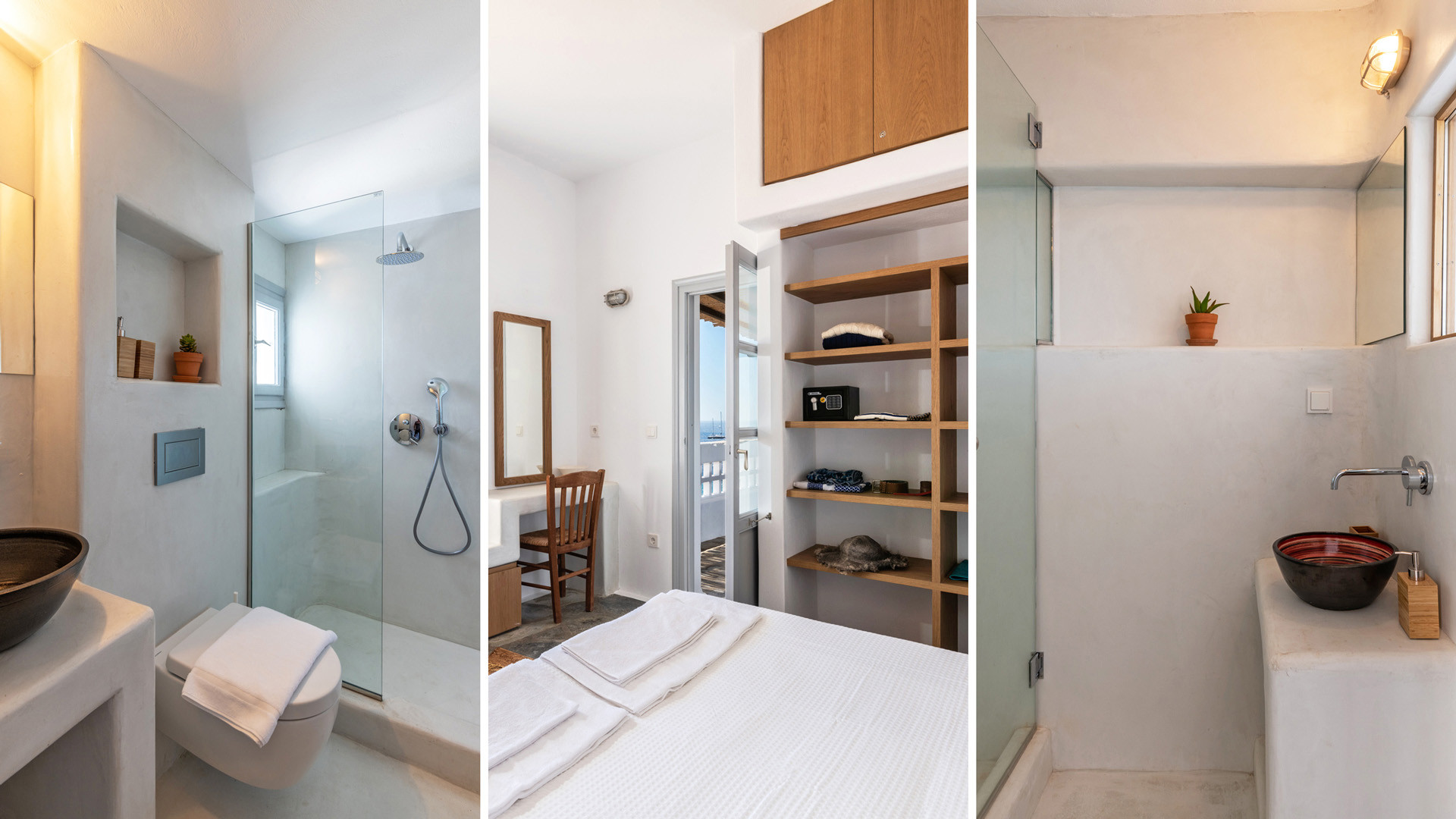 The four bedrooms, all with ceiling fans, A/C and en-suite bathrooms, are spread on two separate levels in true Mykonian style with comfortable beds and minimal aesthetics.