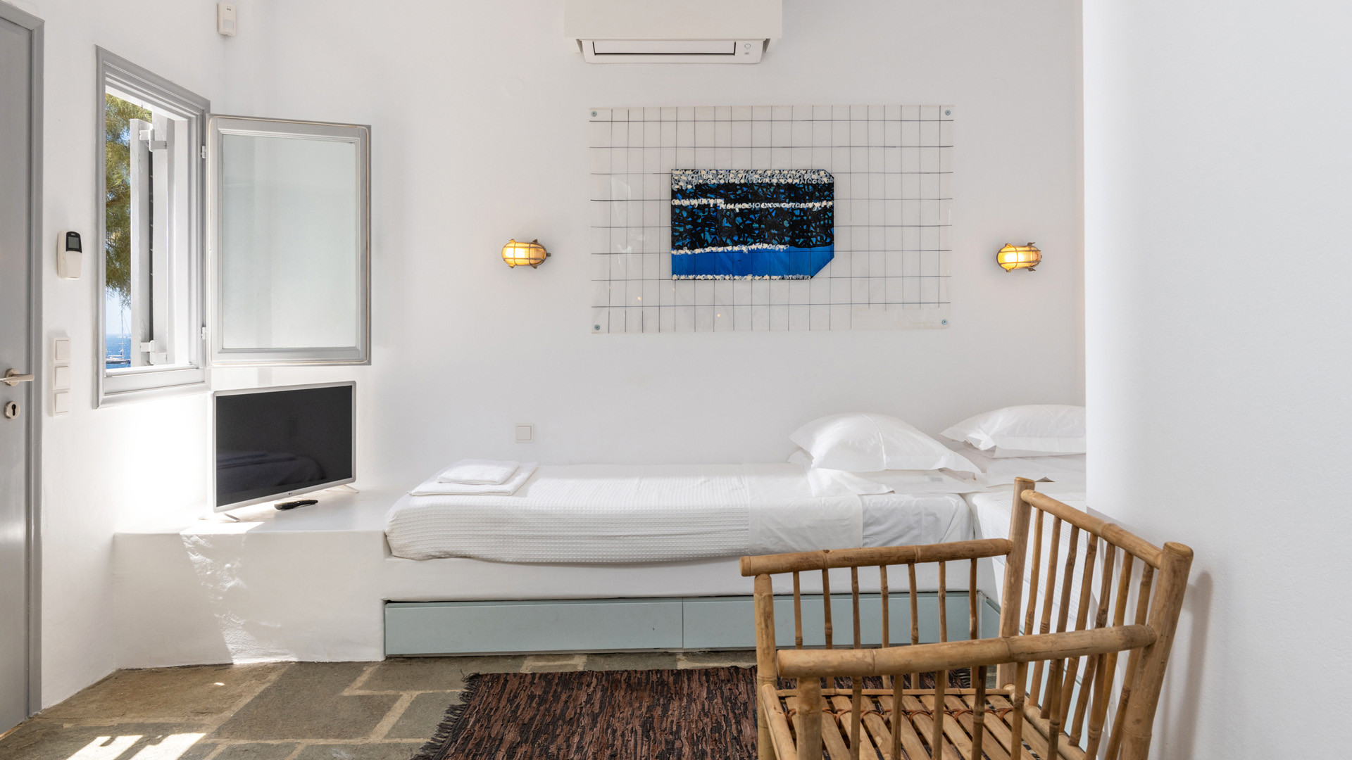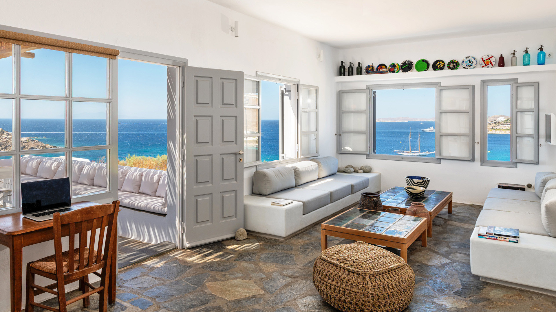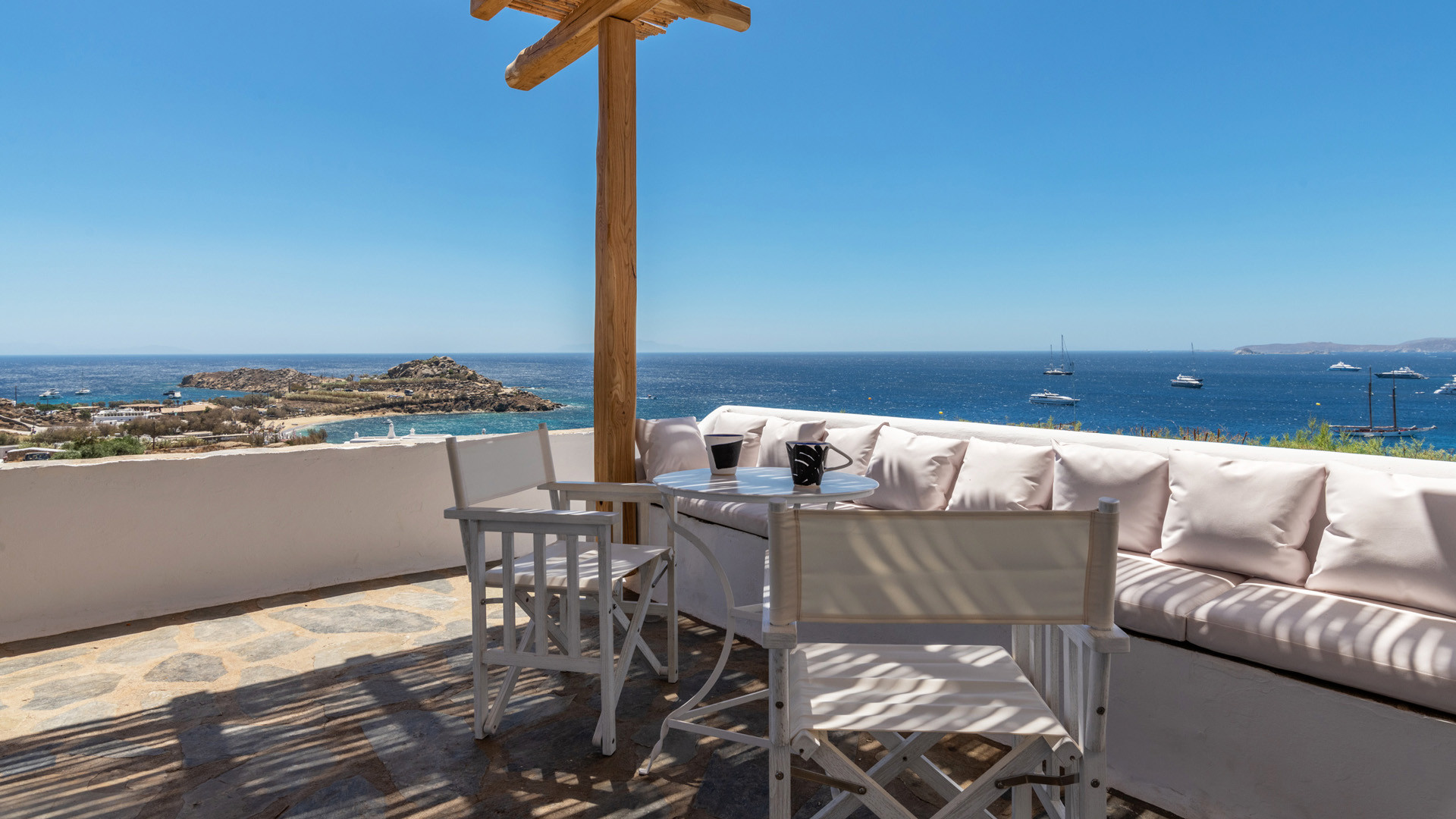 The four bedrooms, all with ceiling fans, A/C and en-suite bathrooms, are spread on two separate levels in true Mykonian style with comfortable beds and minimal aesthetics.