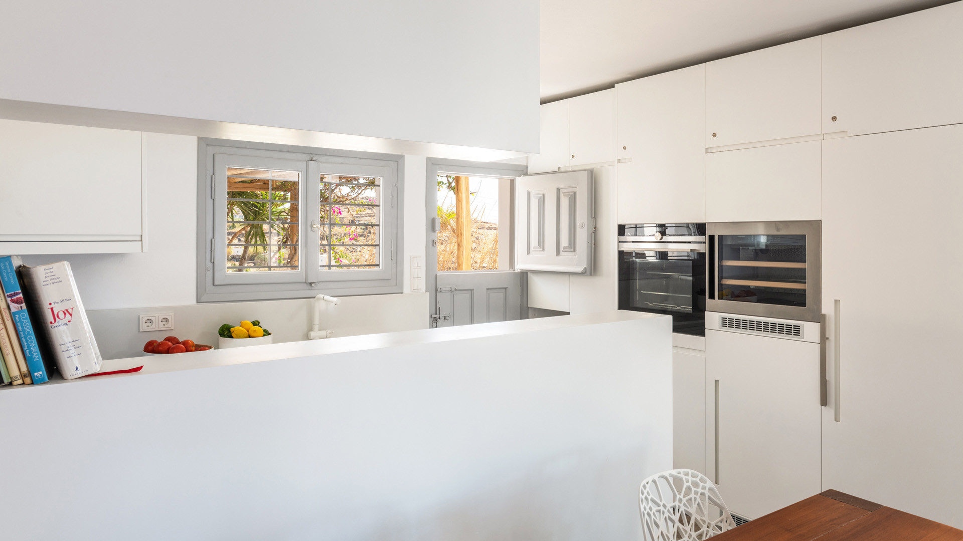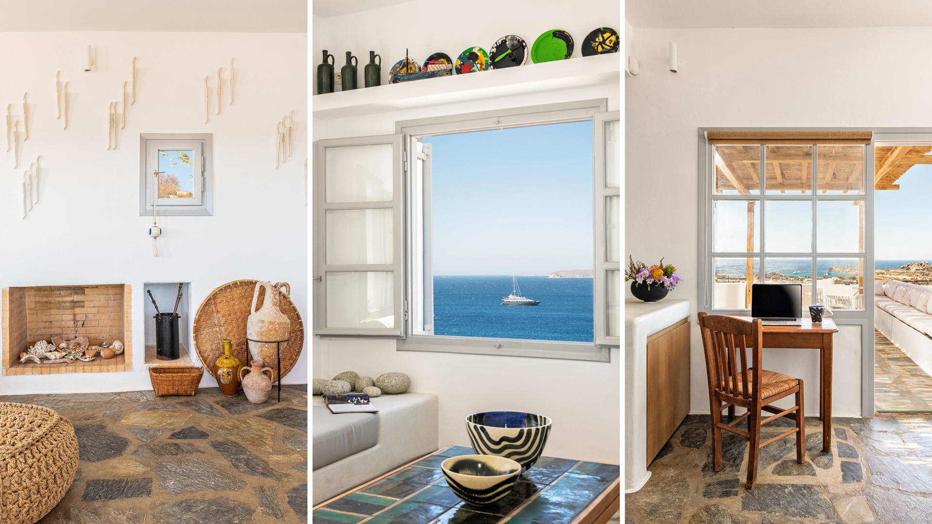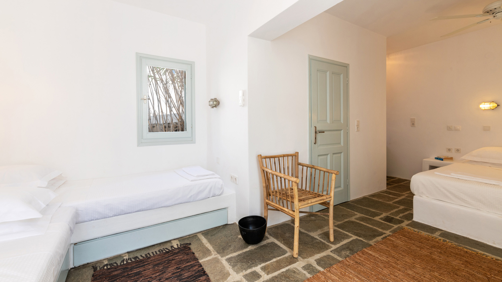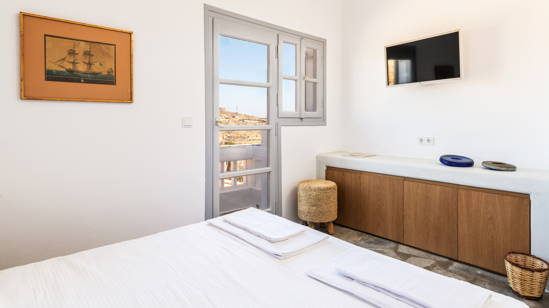 The four bedrooms, all with ceiling fans, A/C and en-suite bathrooms, are spread on two separate levels in true Mykonian style with comfortable beds and minimal aesthetics.