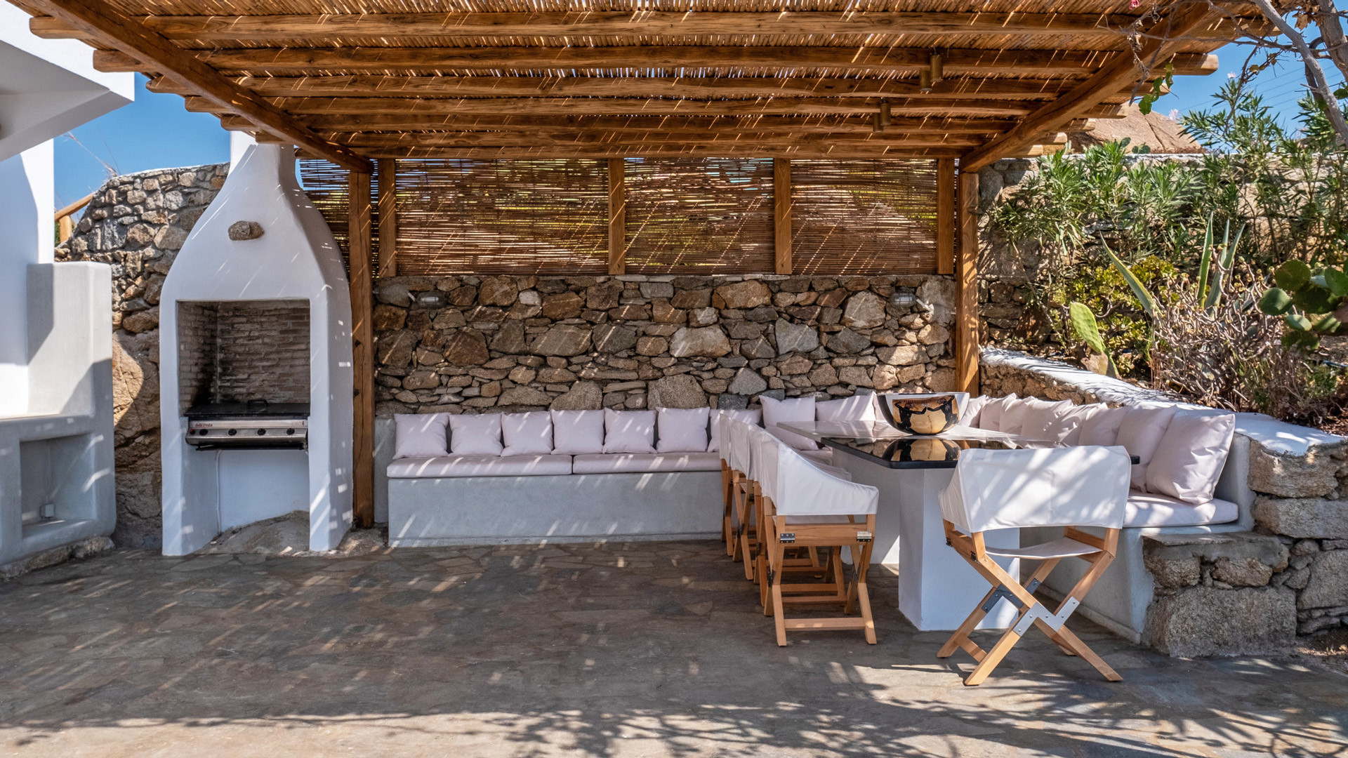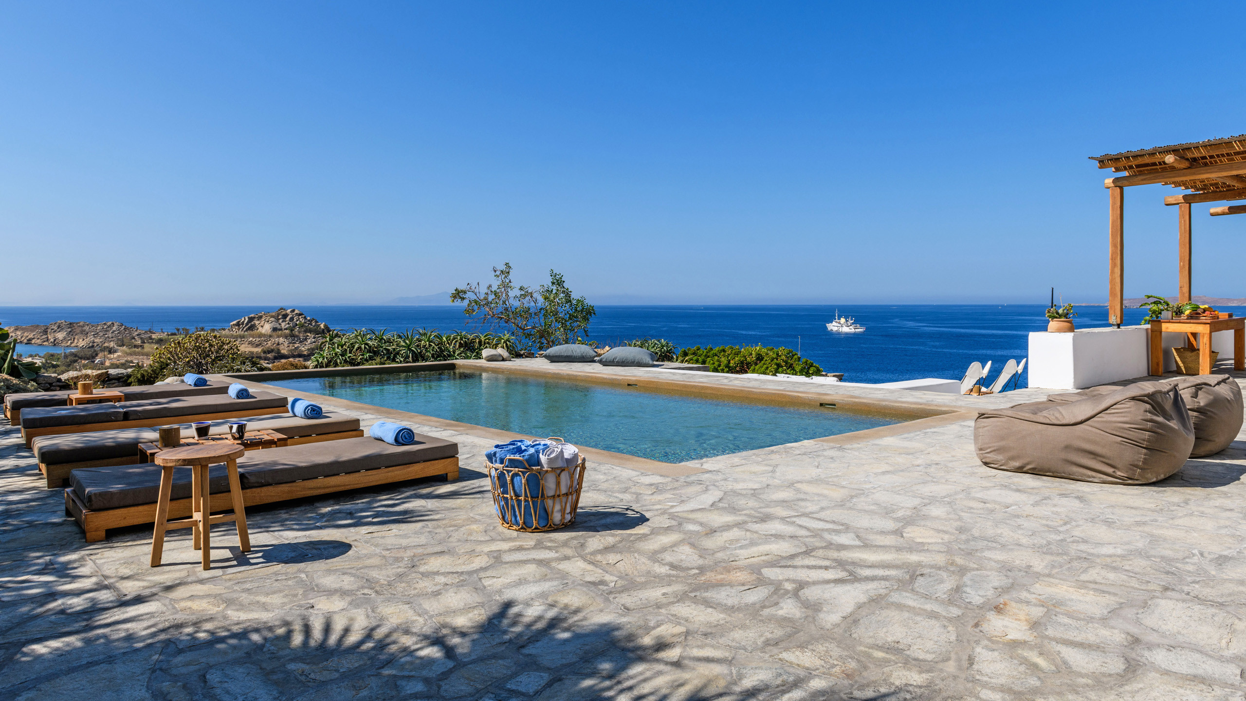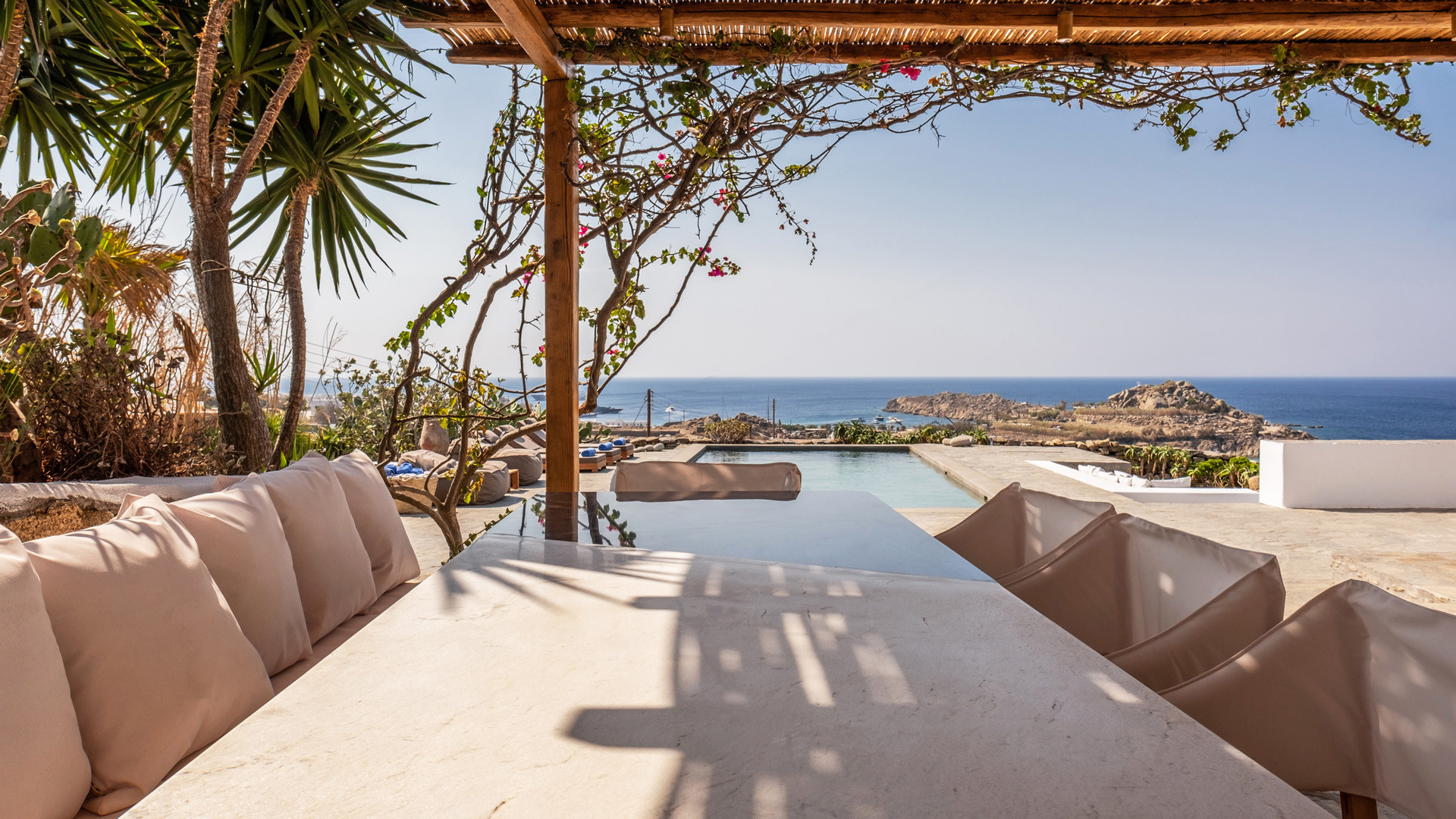 This Cycladic-style bohemian chic villa, features an exterior area dominated by an imposing spacious pool with sunbeds, lounges and sitting areas to enjoy the sun or the sunset, surrounded by enchanting sea views and the coming and going of yachts. Shaded lounging and dining areas under large pergolas offer relaxing al fresco living throughout the day.