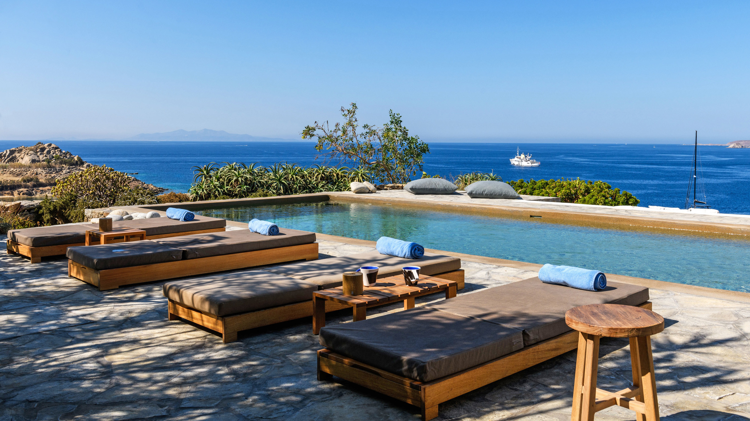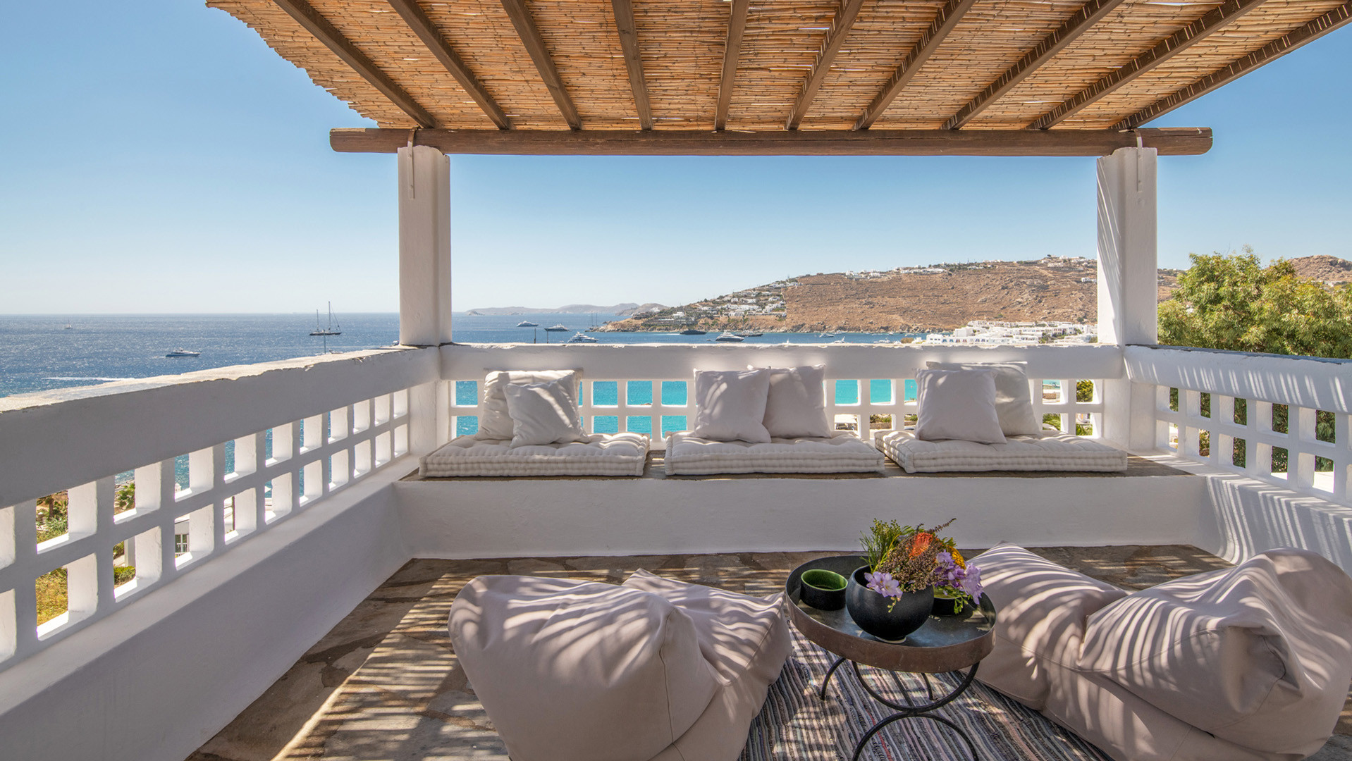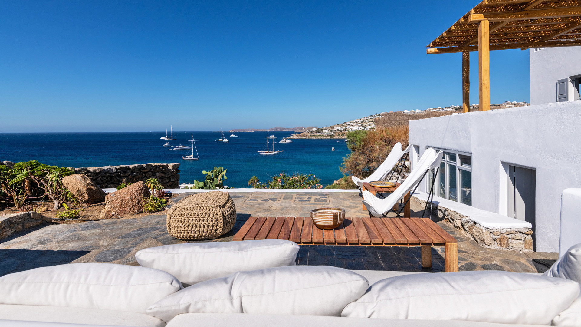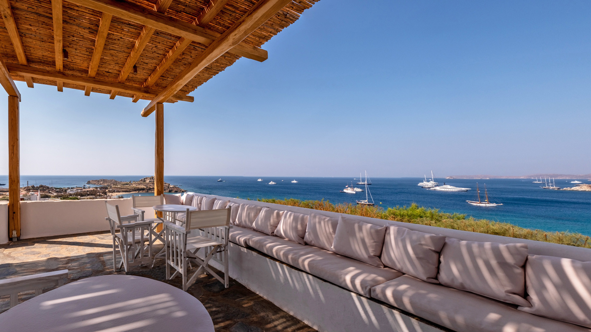 This Cycladic-style bohemian chic villa, features an exterior area dominated by an imposing spacious pool with sunbeds, lounges and sitting areas to enjoy the sun or the sunset, surrounded by enchanting sea views and the coming and going of yachts. Shaded lounging and dining areas under large pergolas offer relaxing al fresco living throughout the day.