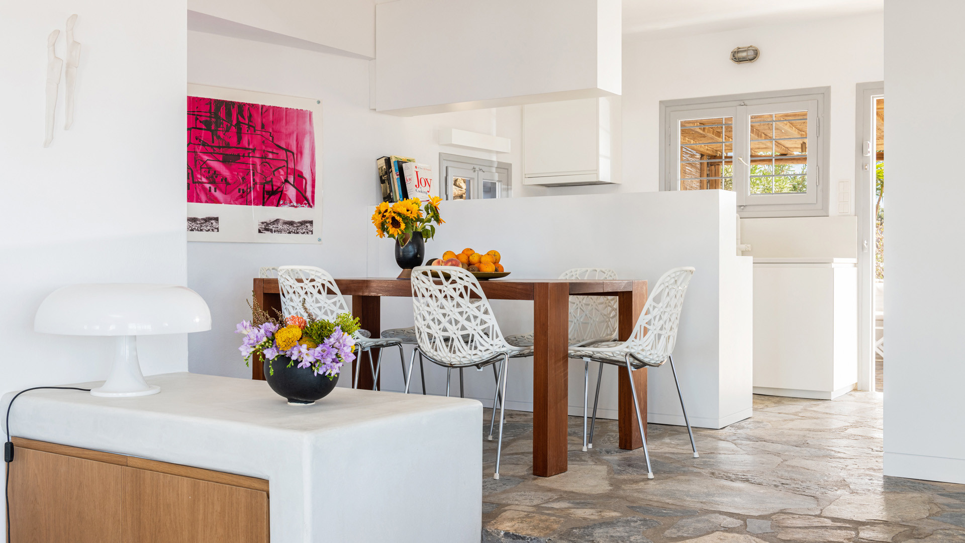 The main floor, comprising of an open-plan living area with fully-equipped modern kitchen, extends to the outdoor pool area, sitting and dining areas, all with stone floors creating a relaxed and casual summer feeling.