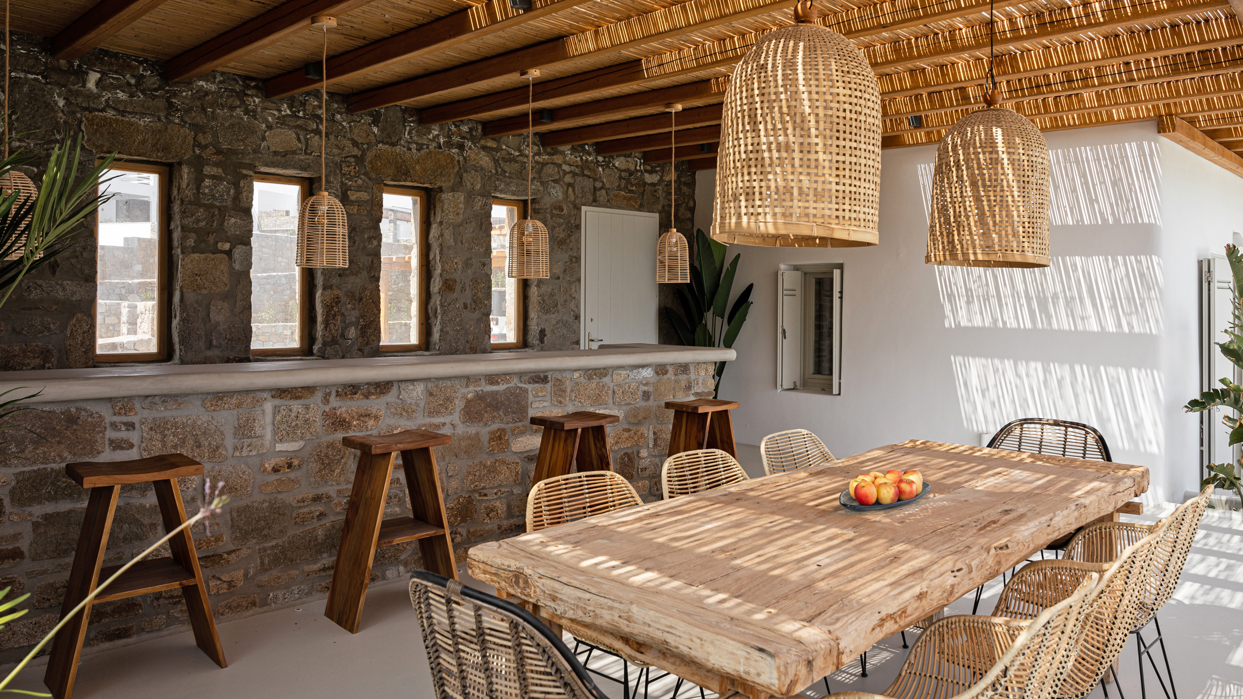 At first glance, the property exudes a welcoming atmosphere, with the enticing private pool playing a pivotal role in the outdoor spaces. It is surrounded by a teak platform adorned with comfortable sun loungers for guests to relax on. Not far away, there is a charming dining area meticulously designed, complete with an outdoor bar.